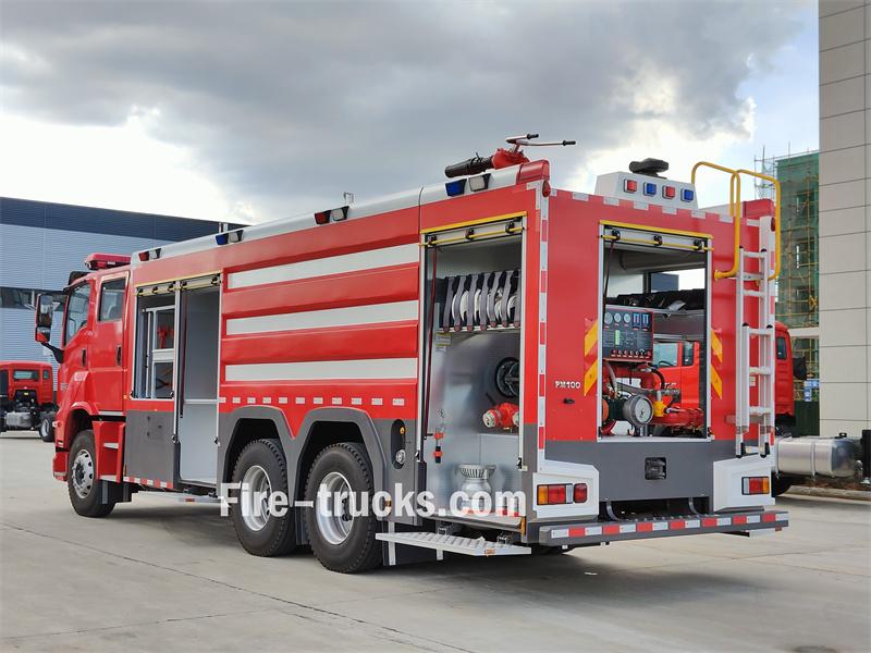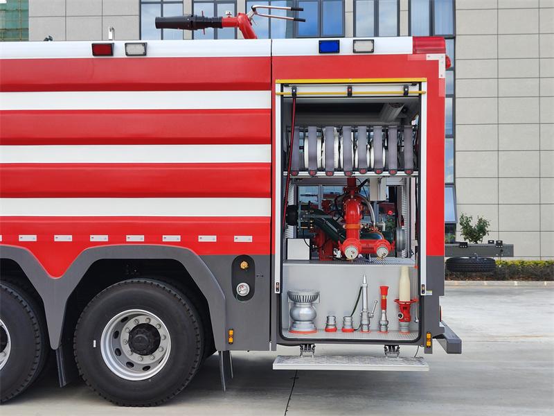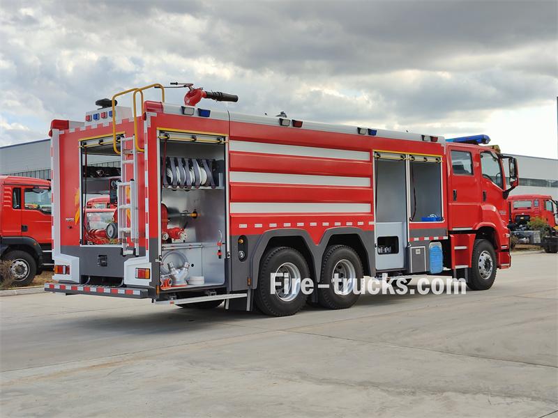 Truk pemadam kebakaran busa Isuzu GIGA 6X4 10 meter kubik didasarkan pada sasis Isuzu GIGA 6X4, dengan jarak sumbu roda 4600mm+1370mm. Truk ini dilengkapi dengan mesin Isuzu 6UZ1-TCG61 dan transmisi Fast 12-speed. Bagian depan struktur atas menampung kompartemen peralatan, bagian tengah berisi tangki air baja karbon 8500L dan tangki busa baja tahan karat 1500L, dan bagian belakang adalah ruang pompa, yang dilengkapi dengan pompa pemadam kebakaran CB10/60-XZ, panel kontrol, selang pemadam kebakaran, peralatan pemadam kebakaran, dll. Monitor pemadam kebakaran PL8/48 terletak di atap.